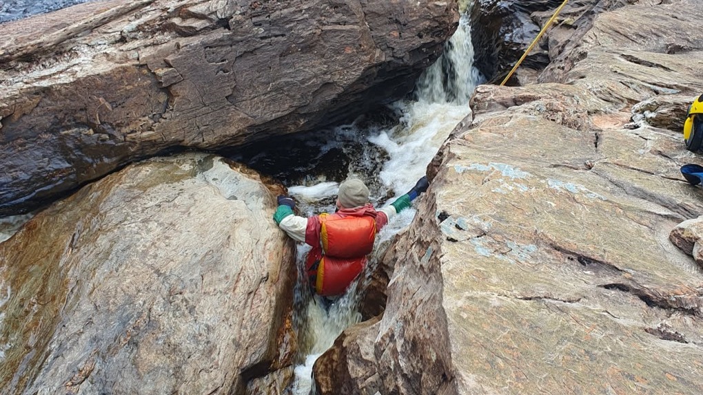 After undertaking an initial risk assessment and identifying the hazards and processes they would take in consultation with the other emergency services, the pair entered the water and assessed the entrapment – the patient submerged in the flowing water, his leg potentially broken and stuck in the crevice, with swelling hindering the rescue.